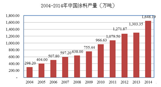 改革开放为我国涂料行业的发展提供了契机,从2004年纸2015年,我国涂料产量持续增加,2009年超过美国跃居全球第一,2014年我国涂料总产量为1648.19万吨,占全球涂料总产量的40%左右,稳居全球第一。在我国涂料生产企业的地区分布中,以华东和中南地区为主,2014 年,广东省、上海市和江苏省的全国涂料产量位居前三的地区,湖南省产量约为125.86 万吨,居全国第四位。数据显示,2014年全国规模以上涂料企业主营业务收入超过3800亿美元,同比增长13.2%。
